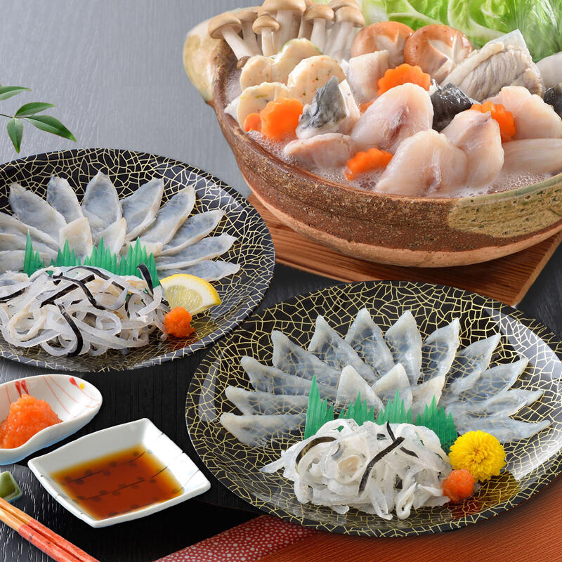【商品内容】とらふぐ刺身(17cm皿)15g×2、真ふぐ霜降り刺身(17cm皿)20g×2、とらふぐ皮20g×4、ふぐちり(シロサバフグ切身、トラフグアラ)200g、ふぐつみれ40g、ふくポン酢100ml、もみじおろし10g×4
