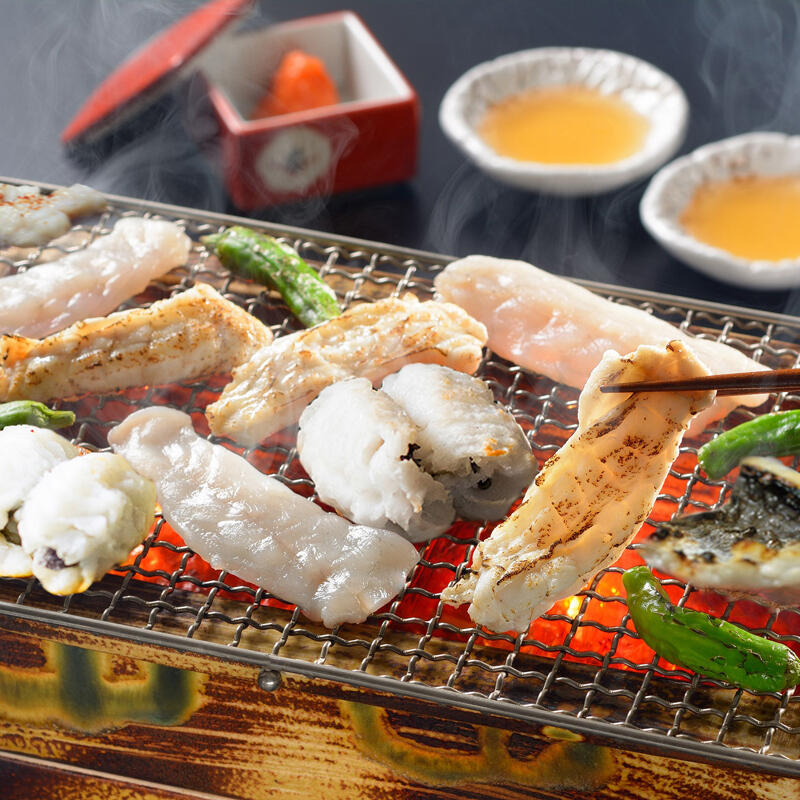 山口県産のはもととらふく身皮のセットです。山口県の瀬戸内海で漁獲されるはもは、淡白で上品な味ながらも、脂肪が多く濃厚な味わいが特徴です。1匹のとらふくから2枚しかとれないうまみの凝縮した部位の身皮と焼いてお召し上がりください。お好みで塩ポン酢、ふく醤油と梅肉またはもみじおろしを加えて、夏の風物詩である焼きはもと焼きふくの食べ比べをお楽しみください。