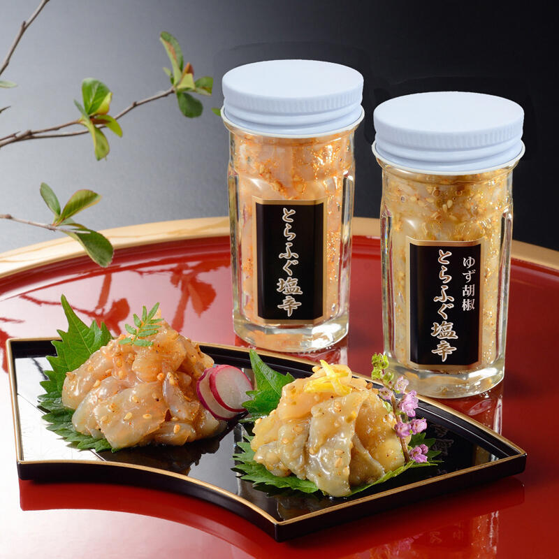 【商品内容】とらふぐ塩辛55g、とらふぐ塩辛(ゆず胡椒風味)55g