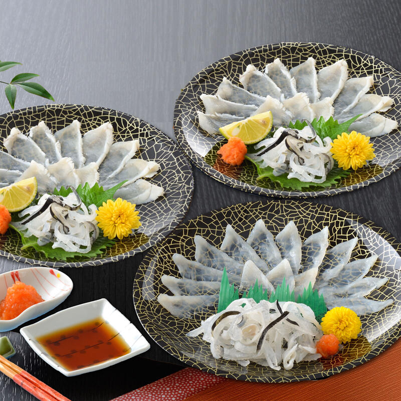 下関の職人が1枚1枚丁寧に菊の花のように盛り付けたとらふく刺身と真ふく霜降り刺身のセットです。とらふくと真ふくを食べ比べてお楽しみください。