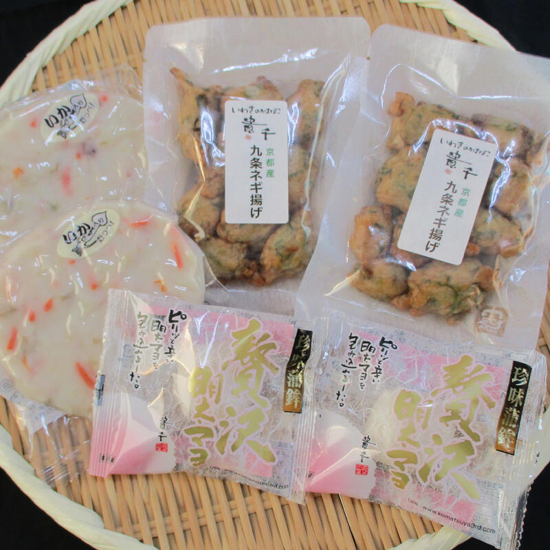 【商品内容】珍味蒲鉾贅沢明太マヨ×2個、白蒸しかまぼこいか×2枚、九条ネギ揚げ80g×2袋
