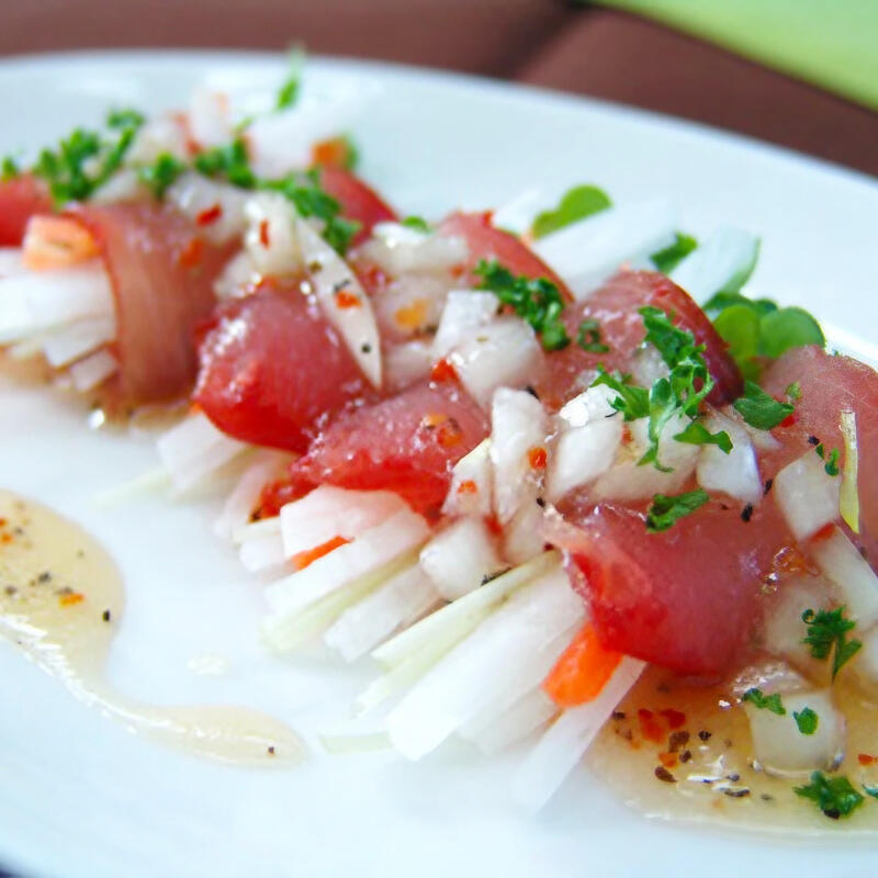 鮪を生ハム仕立てに仕上げスライスしました。燻の薫りとしっとりしたまぐろの生ハムを野菜と一緒にお召し上がりください。