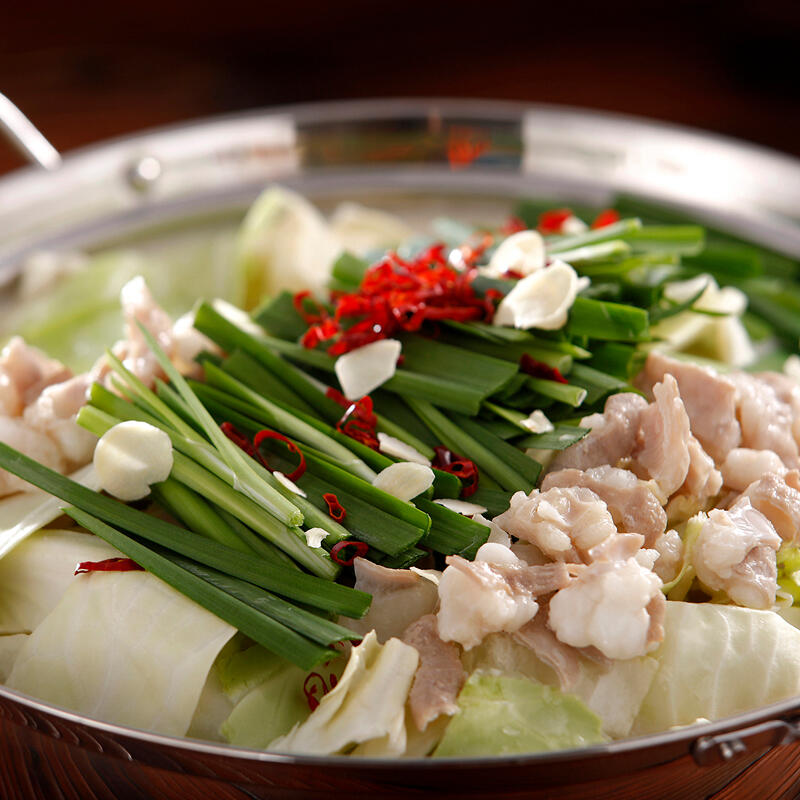 博多を代表する名物のコラボ、とんこつ味のもつ鍋。 牛もつはもちろん国内産を使用。 キャベツ、ニラなどたっぷり入れて食べたあとの 『しめ』のちゃんぽんが格別です。