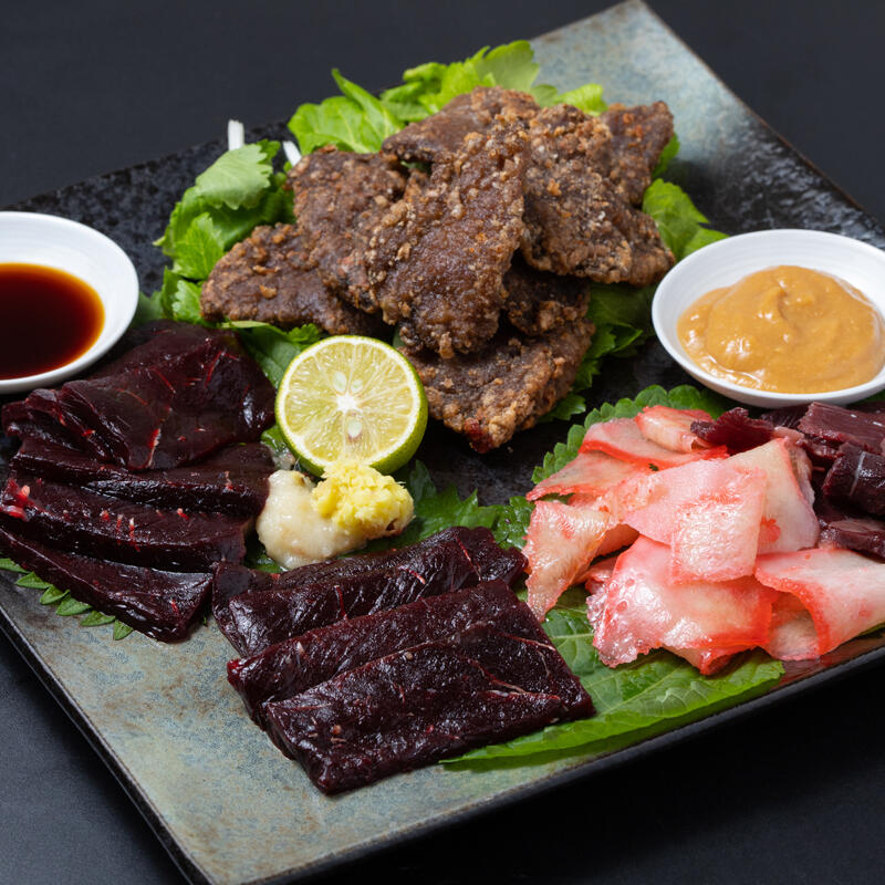 ひげ鯨の胸肉を生姜の風味豊かな醤油味にした昔ながらの竜田揚げと、独自の熟成をかけて解凍時にドリップが少なく、鯨の旨味もたっぷりなお刺身用鯨肉、懐かしい鯨ベーコンのセットです。竜田揚げはバラ凍結なので、冷凍のまま使用したい分だけ調理が可能。赤肉はと生姜醤油やニンニク醤油で食べるほか、ユッケ・レバ刺し風などでもお楽しみいただけます。