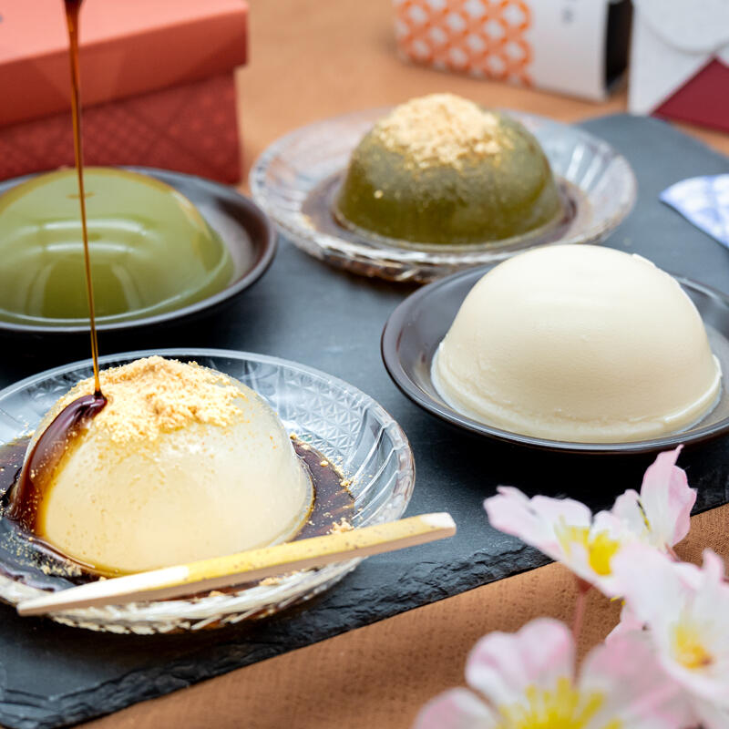 【商品内容】くず餅プレーン(黒蜜5g・きな粉5g付)、くず餅抹茶(黒蜜5g・きな粉5g付)、葛ぷりんプレーン、葛ぷりん抹茶 各75g×各2 計8