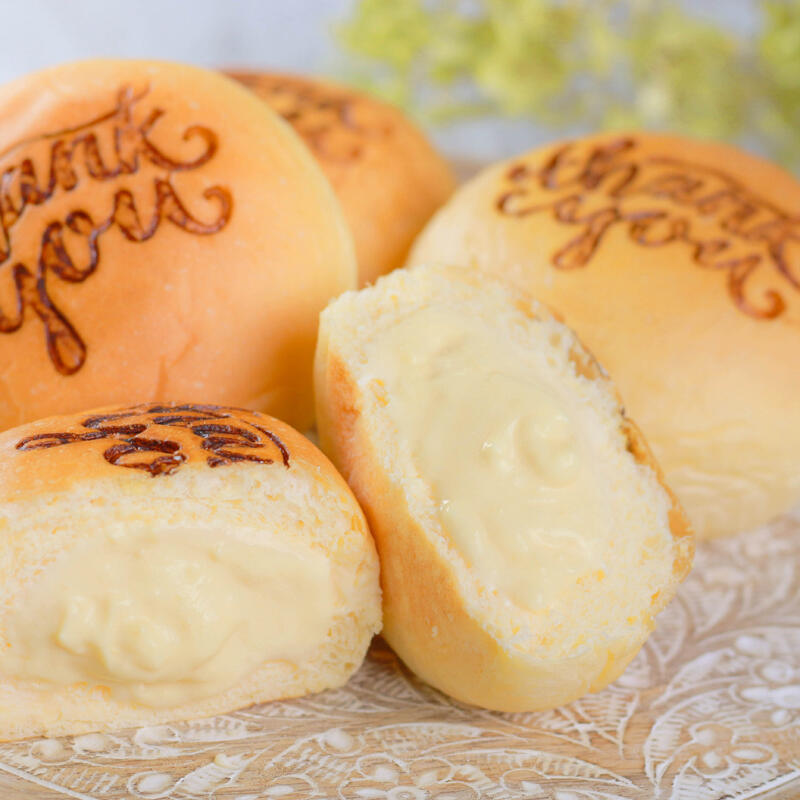 ふんわりとしたパン生地の中には、八天堂自慢のなめらかなカスタードくりーむがたっぷり。「Thank you」の焼印が入ったくりーむパンです。大切な人への感謝の気持ちを込めた贈り物です。
