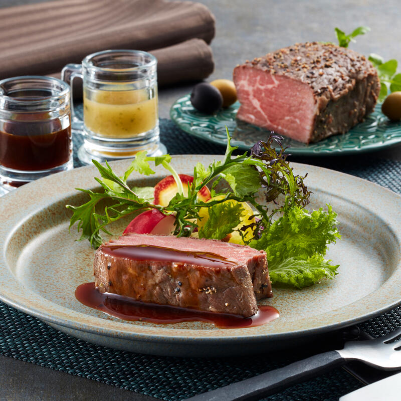 東京西郊の小金井にあるフレンチレストラン「TERAKOYA」監修のローストビーフです。アメリカ産牛肉のモモ部位を使用し、真空調理を行うことにより、素材の風味、旨味を逃さず均一に調理し柔らかい肉質にするため、あえて手間暇をかけて低温で長時間加熱し仕上げました。ソースは、バジルの風味を最大限に引き出し、白ワイン風味やレモンなど爽やかな酸味を効かせ、塩味を効かせビーフコンソメで味を整えた香草ソース(バジル&ソルト)と、濃厚な溜り醤油をベースに、赤ワイン風味、アップルビネガー、チキンエキスを使用しアクセントとしてローレル、クローブ、オニオン、ペッパーなど香辛料を加え味に深みを与えたグレイビーソース(たまり醤油入り)の2種類のソースでお召し上がりいただけます