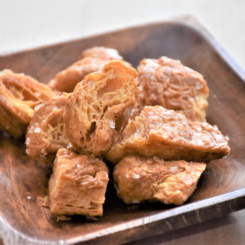 層になったクロワッサンに、ザクザク食感が心地よいザラメ糖を絡め、優しい甘さのラスクに仕上げました。