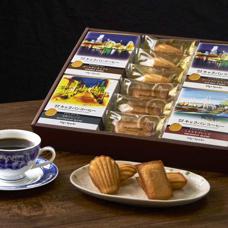 【商品内容】キャラバンコーヒー(ゴールデンキャメル(10g×5)×2、元町ブレンド(10g×5)×1、ミカドヤブレンド(10g×5)×1)・ガトー・ド・ボワイヤージュ(発酵バターマドレーヌ、焦がしバターフィナンシェ×各3)