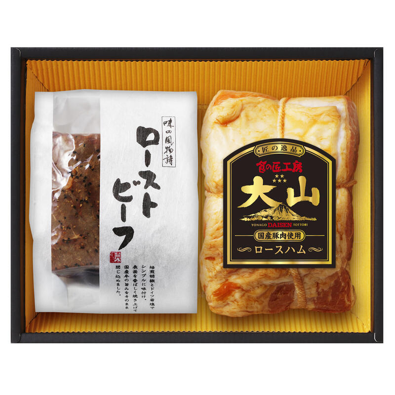 国産豚ロース肉をドイツ岩塩でじっくり漬け込み仕上げたロースハムと、国産牛ロース肉を焙煎胡椒とドイツ岩塩で味付けし香ばしく焼き上げたローストビーフを詰め合わせたセットです。