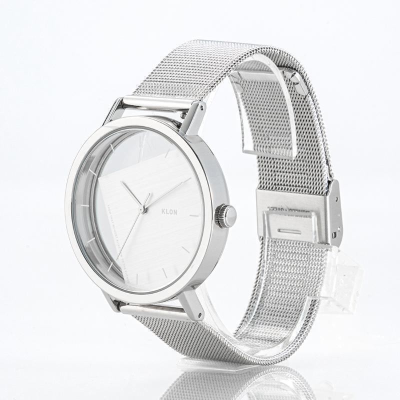 モノトーンを基調にしたスタイリッシュなデザインが人気の「KLON」。円形の文字盤に斜めの四角を重ねたデザインは、KLONならではの美しさを感じさせます。