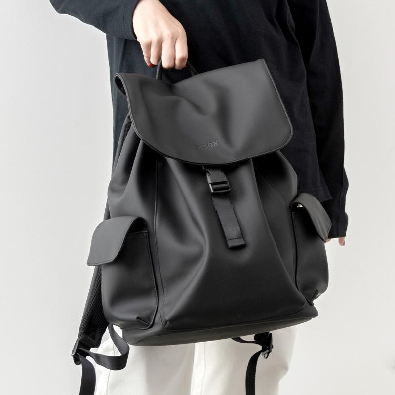 すべてのポケットにフラップ(蓋)が付いた定番スタイルながら、ブラックのマットコーティング素材で上品な印象です。ワイドな開口部と左右から出し入れできるポケットで、荷物の管理もスムーズ。旅先でも普段使いでも頼れる、洗練された機能派リュックです。PCポケットは14インチまで(参考目安)対応。