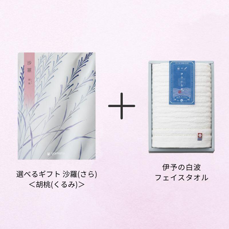 弔事のお返しとしてご好評いただいているカタログギフト『沙羅(さら)』に、今治で丁寧に織り上げた「伊予の白波」フェイスタオルを合わせました。