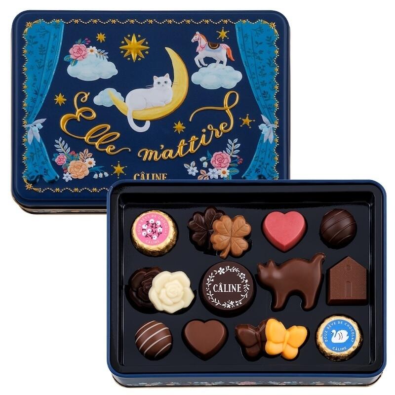 三日月に乗った猫を描いた幻想的なネイビーの缶パッケージに、ハートやバラ、猫の形のチョコレートなど色とりどりのチョコレートを詰め合わせました。フルーツやナッツ、はちみつなど味のバラエティも豊か。缶パッケージは、リユースしたくなる可愛さ。