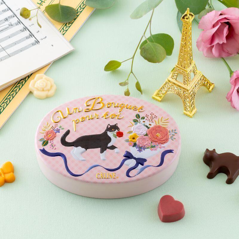 花をくわえた猫が印象的な淡いピンクの缶パッケージに、ハートやバラ、猫の形のチョコレートなど色とりどりのチョコレートを詰め合わせました。フルーツやナッツ、コーヒーなど味のバラエティも豊か。