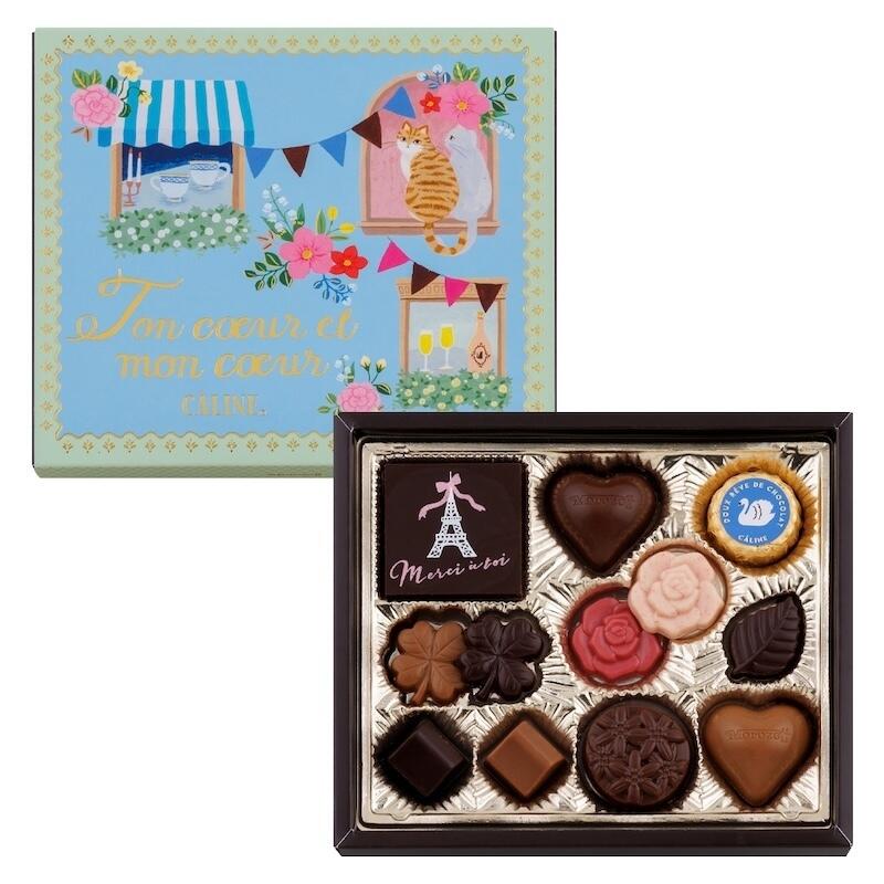 バラやクローバーなど様々な形のチョコレートをボリュームたっぷりに詰め合わせました。定番のミルク、エキストラミルク、セミスイートの味わいに加え、ポイントにストロベリーとカシスの味わいも。2匹の猫が描かれたブルーとグリーンの爽やかなパッケージです。