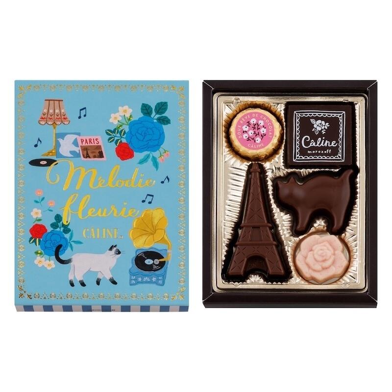 猫やエッフェル塔、バラなどキュートな形のチョコレートを詰め合わせました。定番のミルク、セミスイートの味わいに加え、ポイントにストロベリーの味わいも。可愛い猫や雑貨を描いた淡いブルーのパッケージです。