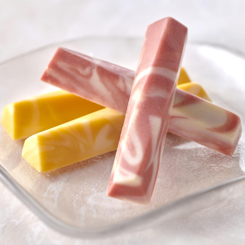 ホワイトチョコレートにイチゴとマンゴーを合わせました。マーブル模様のフルーツチョコレートが楽しめます。