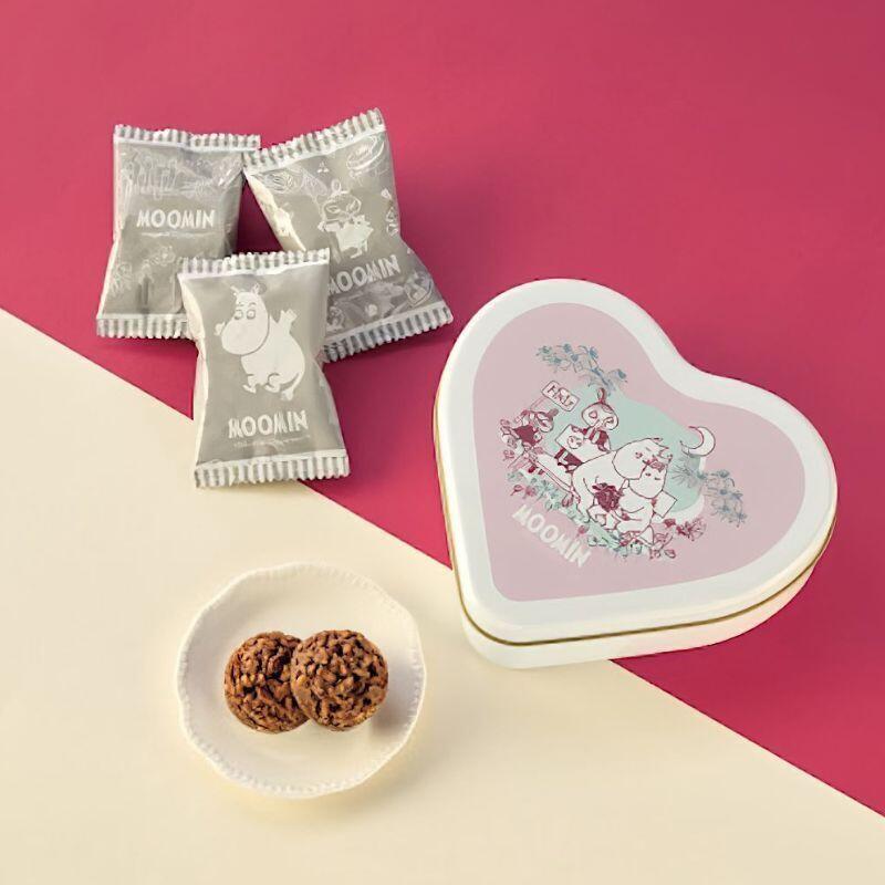 ムーミンとスノークのおじょうさんが寄り添う、かわいらしいデザインのハート缶。中にはチョコクランチを詰合せました。大切な人への贈り物や、自分へのご褒美にもおすすめです。