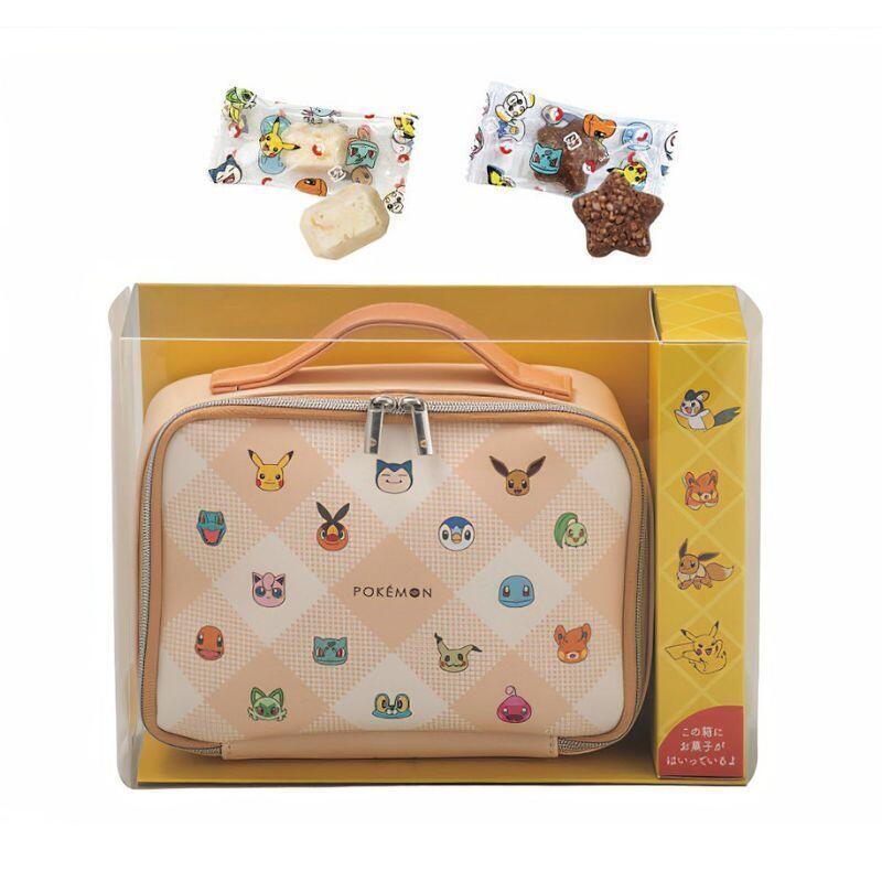 たくさんのポケモンたちをちりばめたデザインのバニティポーチとお菓子のセットです。