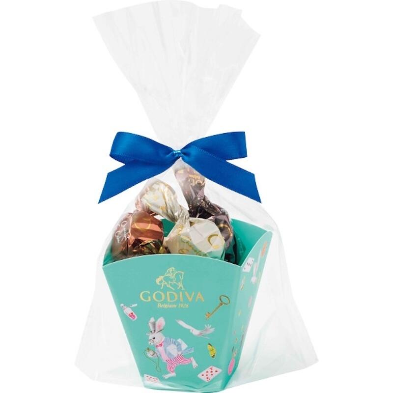 物語のシンボルのトランプやティーセットなどを描いた、小さなブーケのような可愛らしいパッケージに、ホワイトチョコレートプラリネ、ミルク、ダーク、2026年バレンタインより新登場のダーク ストラッチャテッラのG キューブ チョコレートを詰め合わせました。
