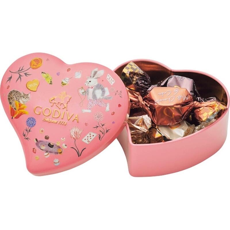 大人かわいいタッチで描かれたチェシャ猫や白うさぎをデザインしたハート形の缶に、ホワイトチョコレートプラリネ、ミルク、ダーク、2026年バレンタインより新登場のダーク ストラッチャテッラのG キューブ チョコレートを詰め合わせました。