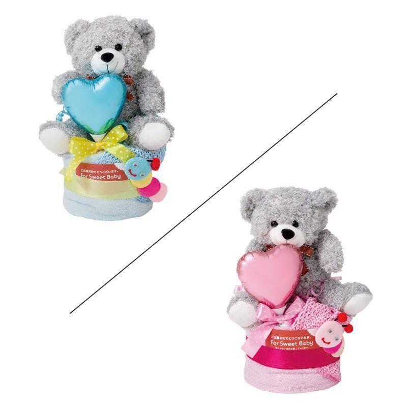 現品・内容・サイズ・材質: パンパース紙おむつSサイズ10枚・約34×80cmタオル1枚・綿100%・高さ約20cmクマのぬいぐるみ1体・約15×14cmベビー帽子1個・ポリエステル100%(伸縮性あり)・バルーン付
