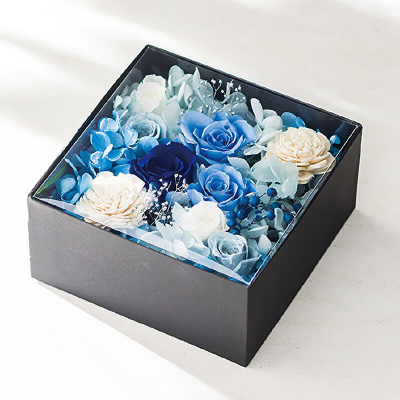高級感のある紙製ボックスの中は枯れないお花の庭園。生花を特殊な溶液につけ保存加工したプリザーブドフラワーは洗練された繊細さと美しさを表現してくれます。クリアな蓋付き。