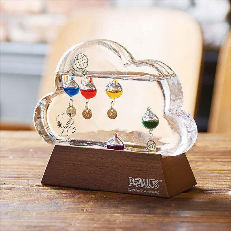 気球を浮かべるスヌーピーが可愛い雲形のガリレオ温度計。カラフルなガラス球が、まるで雲に浮かぶ気球のよう。温度によって様子が変化する、不思議なインテリアアイテムです。お部屋に置きやすいコンパクトなサイズ感で、お部屋をぐっとオシャレに彩ってくれます。