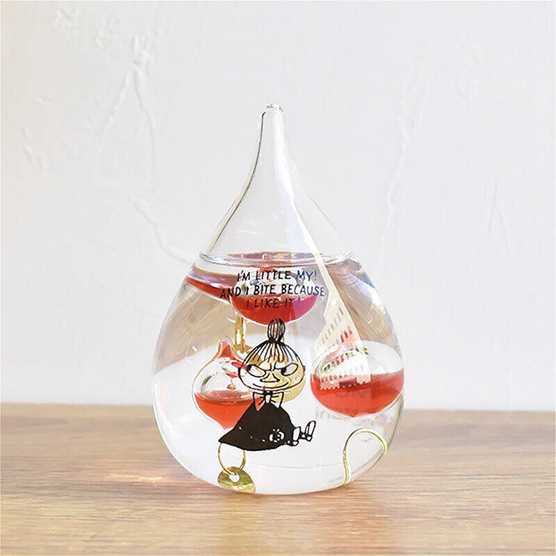 リトルミイのイメージカラーで揃えた赤いガラス球が、お部屋のアクセントに♪2度刻みで刻印されたゴールドのプレートが現在の温度を示します。ガラスの透明感がインテリアに馴染みやすく、どこか涼し気な印象を与えてくれます。物理学者のガリレオ・ガリレイが発見した「液体の比重が気温によって変化する」原理を用いて作られた温度計です。ガリレオ温度計とも呼ばれ、実際の基本は上層部に浮いているガラス球体についたプレートで読み取ります。正確な温度を測る為にはお使い頂けませんが、インテリアオブジェとして球体の浮き沈みや季節での変化を楽しむ事ができます。手のひらに乗るほどのサイズ感は置き場所を選ばず、デスクや棚の空いたスペースなどを飾るのにぴったり◎