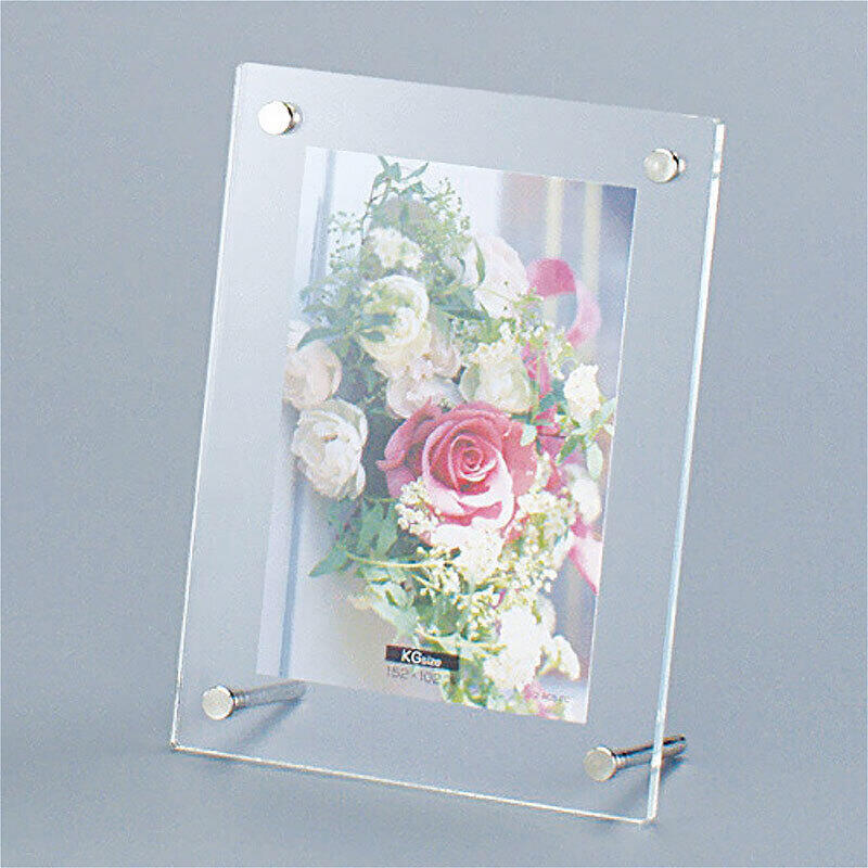 アクリル製 スタンドタイプのピクチャーフレーム。2枚のアクリルいたにプリントを挟み、ビスで固定します。
