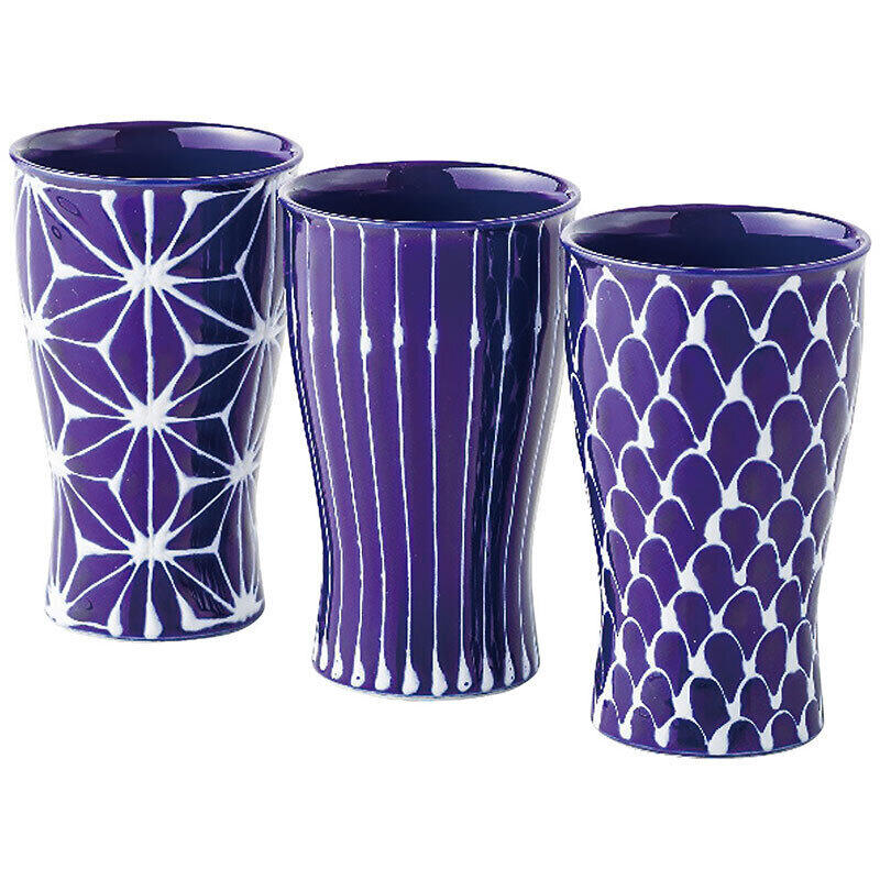 瑠璃釉を基調に白イッチンで一線一線描かれた贅沢な器は、江戸切子のような伝統的意匠を感じさせる。柄は「麻の葉」「雨垂れ」「網絵」の3種類。