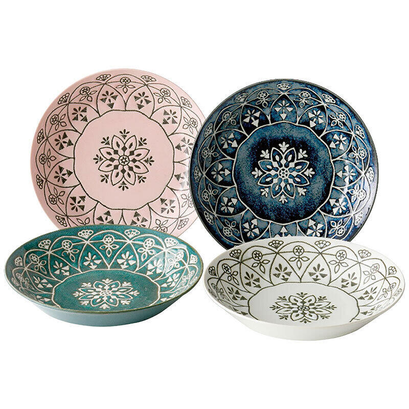 現品・内容・サイズ・材質: 直径20.5cm高さ4cmパスタプレート4枚・磁器
