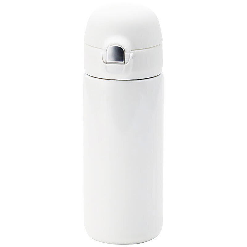 真空2重構造で長時間、保温・ボタン一つですぐ飲めるワンタッチ構造。シンプルな白一色ですっきりデザイン。ロック付きでカバンの蓋が開く誤動作を防止!