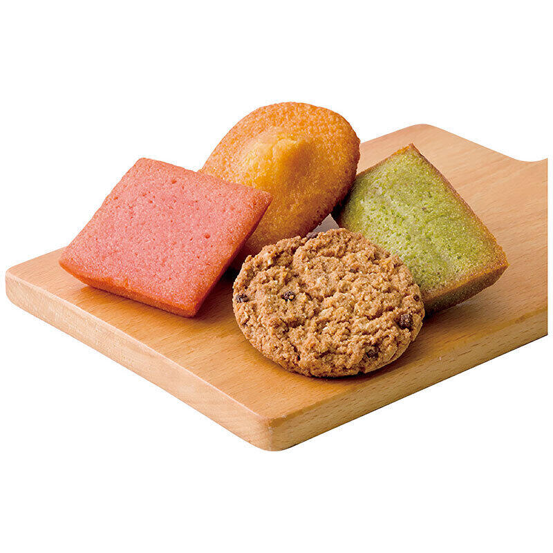 現品・内容・サイズ・材質: オレンジマドレーヌ・ストロベリーショコラケーキ・ピスタチオフィナンシェ・チョコチップクッキー各1個