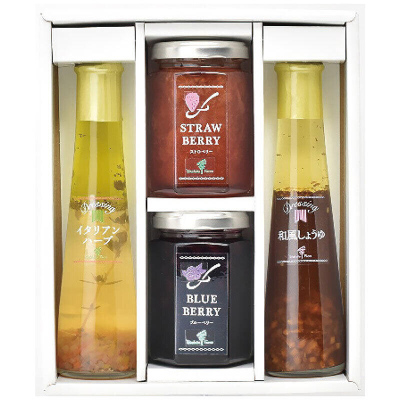 現品・内容・サイズ・材質: ジャム145g(ストロベリー・ブルーベリー各1個)・ドレッシング122ml(イタリアンハーブ・和風しょうゆ各1本)