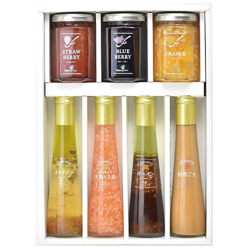 現品・内容・サイズ・材質: ジャム145g(ストロベリー・ブルーベリー・オレンジ各1個)・ドレッシング122ml(イタリアンハーブ・ノンオイル大根と人参・オニオンハーブ・焙煎ごま各1本)