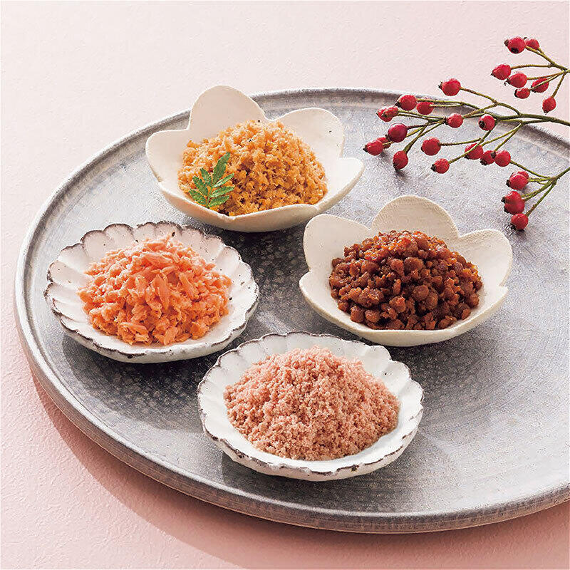 現品・内容・サイズ・材質: 焼鮭ほぐし2瓶・たらこほぐし・鮭めんたい・鶏そぼろ各1瓶・各50g