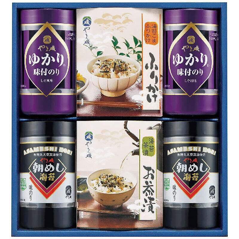 現品・内容・サイズ・材質: 味付のり(8切26枚)・しそ風味のり(8切26枚)各2個・のり茶漬(5.5g×4袋)・のりふりかけ(5g×4袋)各1箱