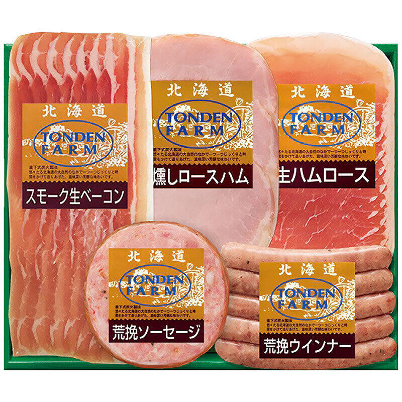 現品・内容・サイズ・材質: 生ハムロース(スライス)40g・スモーク生ベーコン(スライス)60g・燻しロースハム(スライス)60g・荒挽ソーセージ70g・荒挽ウインナー100g各1個