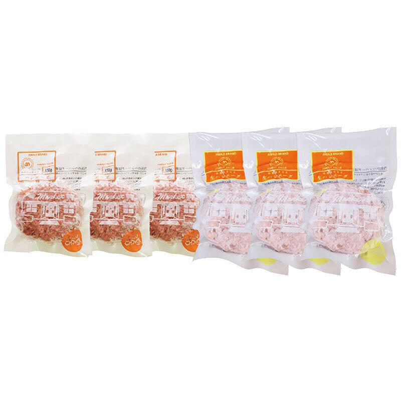 現品・内容・サイズ・材質: 熟成淡路牛100%ハンバーグ・えびすもち豚と淡路牛の合挽ハンバーグ各3個・各150g
