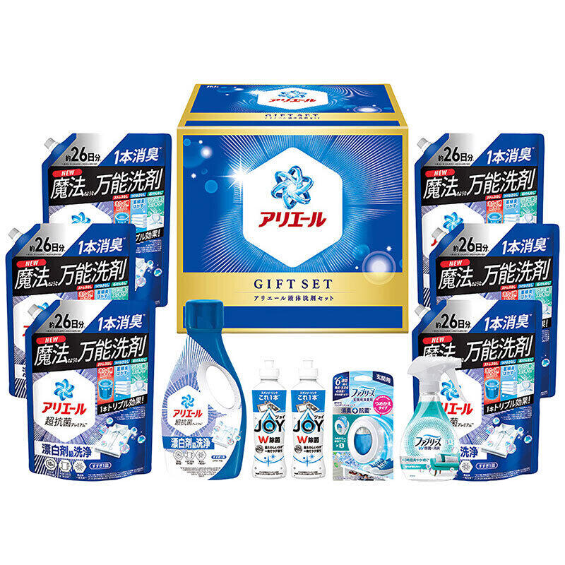 現品・内容・サイズ・材質: アリエールジェル・ファブリーズW除菌各1本・アリエールジェル超特大サイズ(詰替用)6個・除菌ジョイコンパクト2本・ファブリーズ玄関用消臭剤+抗菌1個