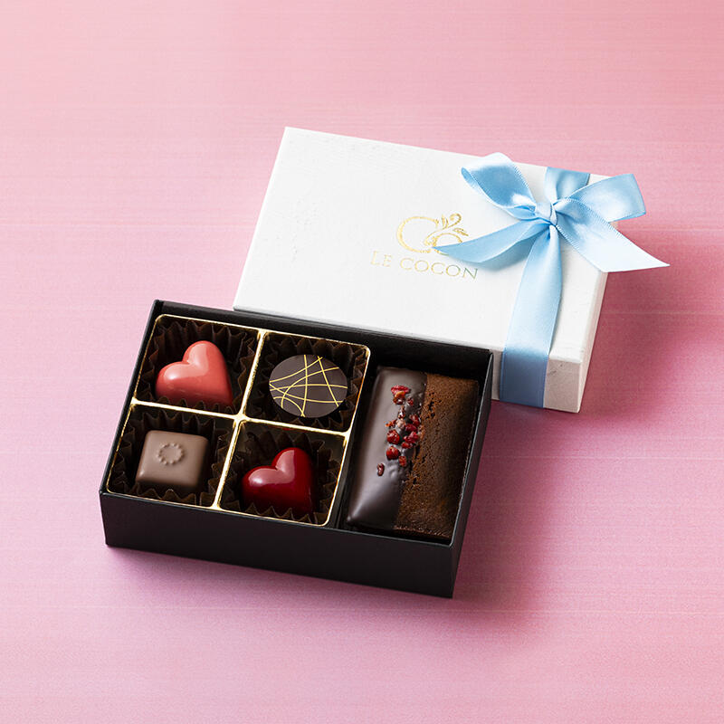 詰め込んだガナッシュに個性が光るボンボンショコラ4種と、ドゥーブルショコラフィナンシェのセットです。丁寧に作り上げたボンボンショコラと、ココア香る大人の味わいのフィナンシェを楽しめます。