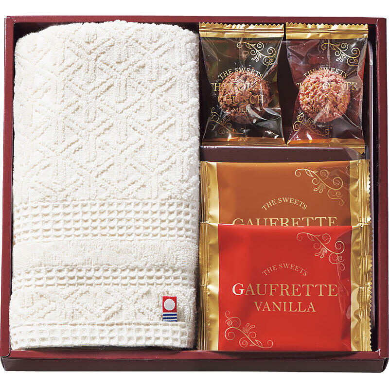 ゴーフレット(チョコ)×1・ゴーフレット(バニラ)×1・チョコレートクランチ(ミルク)×1・チョコレートクランチ(ストロベリー)×1・ウォッシュタオル(約34×35cm・綿100%・日本製)×1