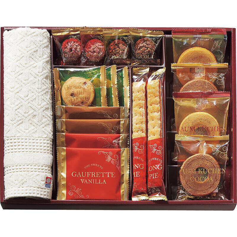 チョコチップクッキー×3・ロングスティックパイ×2・バウムクーヘン(ココア)×2・バウムクーヘン(バニラ)×2・ゴーフレット(チョコ)×2・ゴーフレット(バニラ)×2・チョコレートクランチ(ミルク)×2・チョコレートクランチ(ストロベリー)×2・ウォッシュタオル(約34×35cm・綿100%・日本製)×1