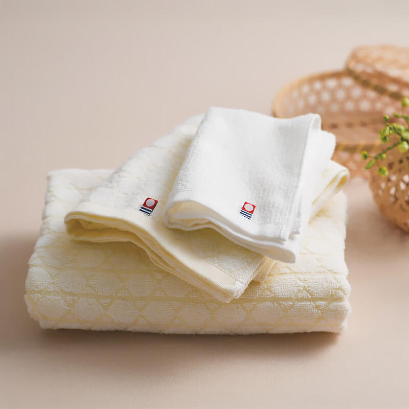 「かごめ紋様」と「あぜ織布」の日本の伝統的な模様をあしらったやさしい色合いの今治タオル。伊予の穏やかな地で百三十年の伝統が織りなす季節を紡ぐタオルです。