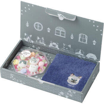 今治製でかわいいニャンコのワンポイント刺繍入りのやわらかな触り心地のハンカチと、カラフルな金平糖と、猫や肉球の形のラムネがセットになりました。ラムネは、伝統菓子・落雁の技術を活かして作られた、和三盆糖入りの上品なお菓子です。カリッと軽やかな食感と、そのあとはふわっと口の中でほどけていく、やさしい口どけ。楽しいおやつタイムになること間違いなしの可愛らしさです。