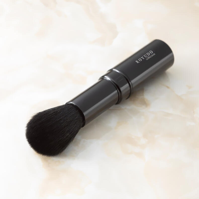 携帯性に優れた収納式チークブラシです。上質な山羊毛(粗光峰)を使用しているので、肌触りが非常に良いです。また、粉含みが良く程よいコシもあります。金具を回しながら毛先が出てくるので、毛先の長さで弾力調整が可能です。