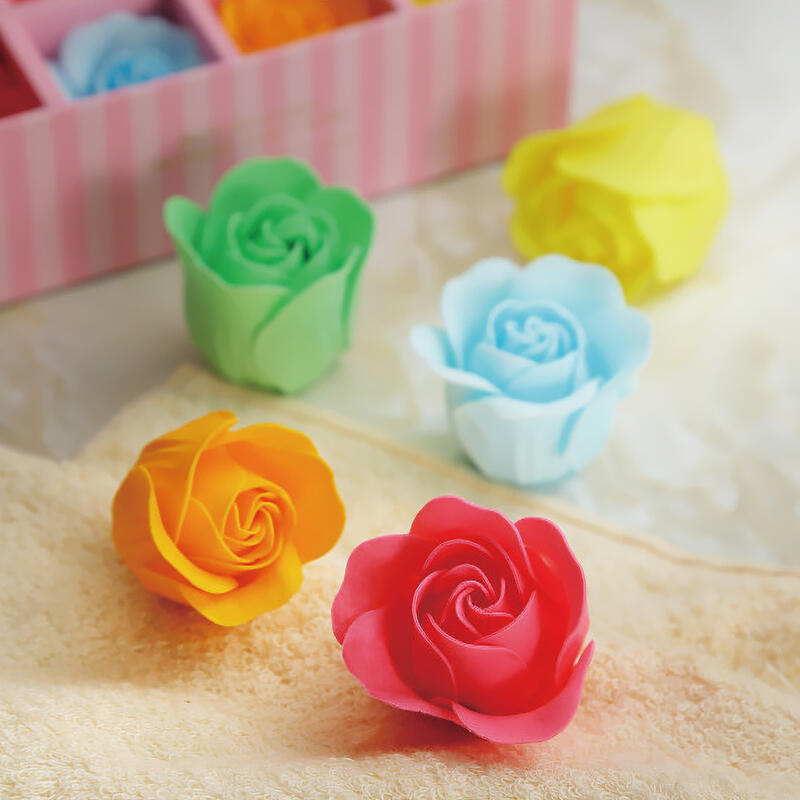 カラフルに並んだ花のカタチの入浴剤。インテリアのアクセントとして飾る空間を演出します。そのまま飾って楽しんだあとは入浴剤としてお風呂に花びらを浮かべて贅沢なひとときをお楽しみいただけます。