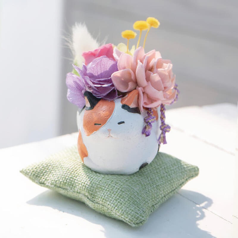 プリザーブドフラワー(バラ、アジサイ、グリーンモス)、アートフラワー、ドライフラワー、和紐、器(猫・レジン製)